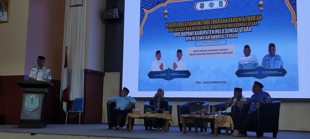 Hulu Sungai Utara (28/11) – Sebanyak 2499 ustadz dan ustadzah dari berbagai Taman Pendidikan Al-Qur’an (TPA) se-Kabupaten Hulu Sungai Utara (HSU) memadati Aula Idham Khalid pada Rabu (26/11/25). Mereka berkumpul untuk mengikuti Pelatihan Metode Iqra dan Tahsin yang digelar oleh LPPTKA BKPRMI HSU, guna meningkatkan kompetensi dalam mengajar Al-Qur’an.